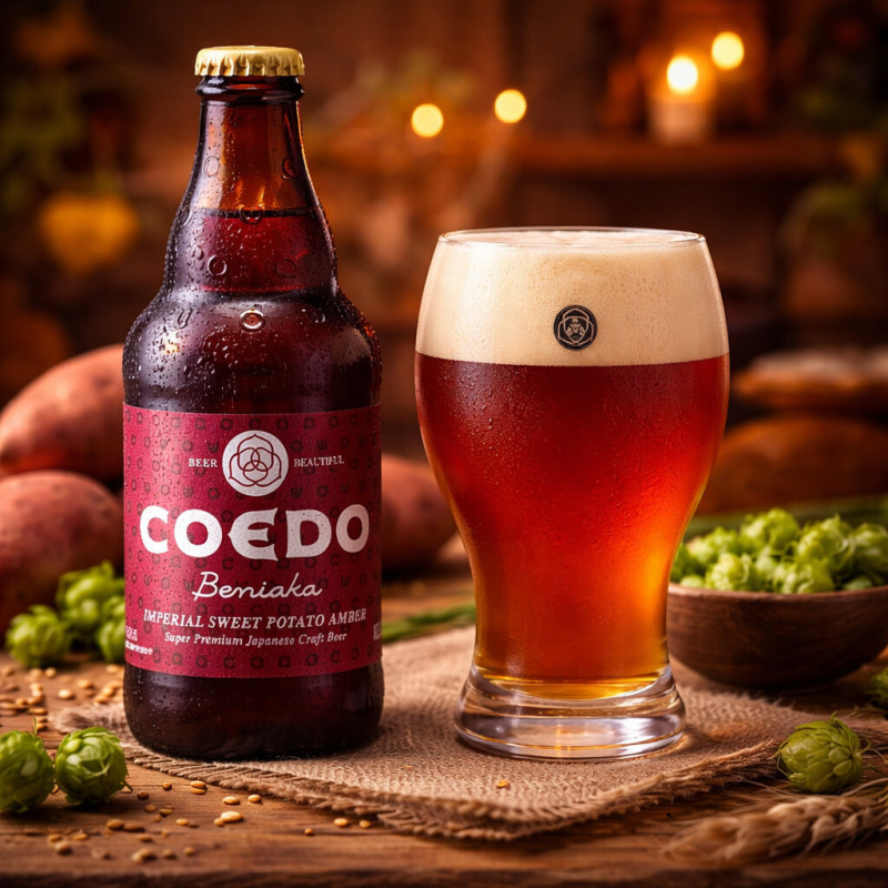 La Coedo Beniaka es una cerveza artesanal japonesa verdaderamente única. Elaborada en Saitama (Japón), esta Amber Ale incorpora boniato asado japonés Kintoki Imo, un ingrediente tradicional que le confiere un perfil aromático y de sabor inconfundible, con notas dulces, terrosas y sutilmente ahumadas.