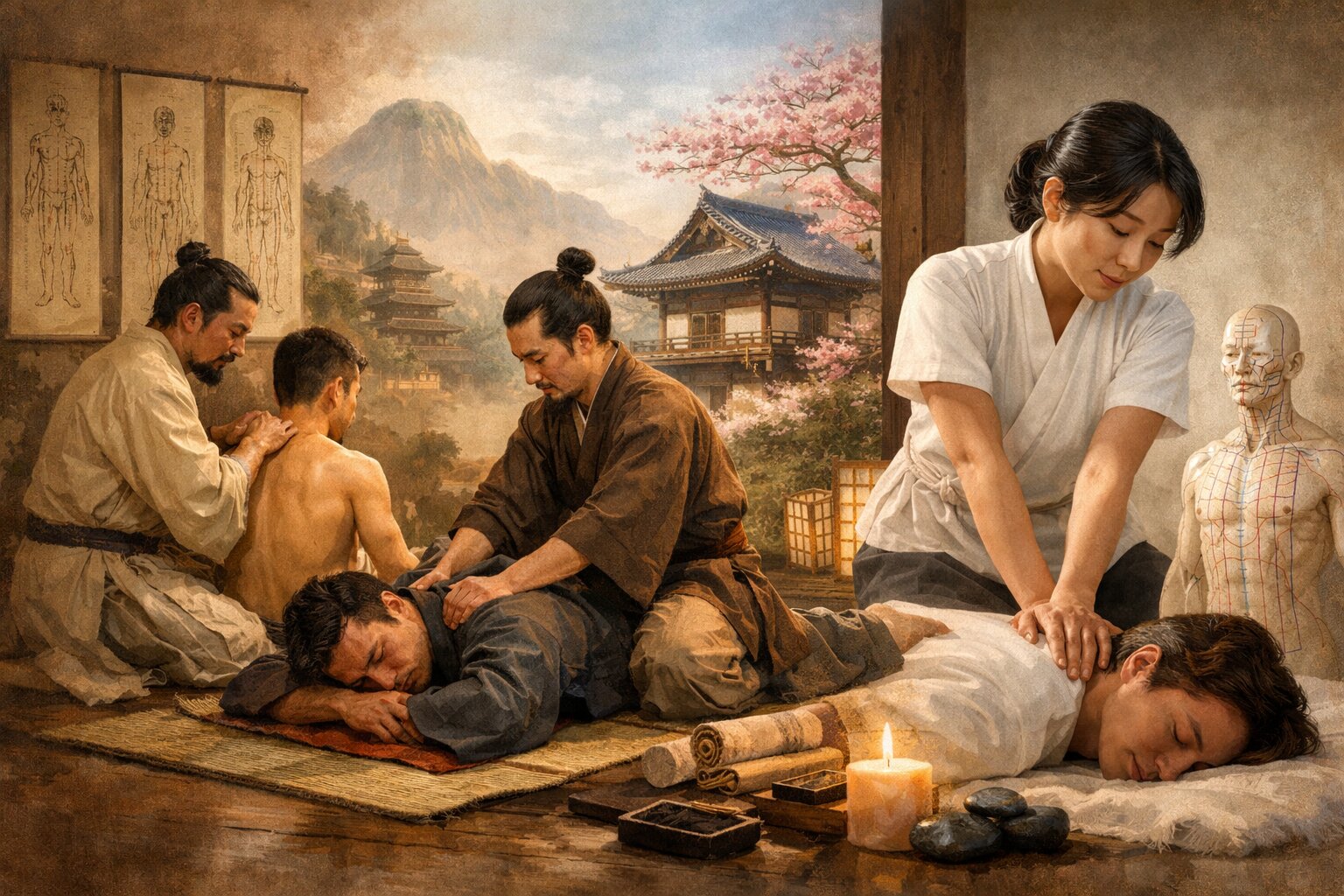 Las raíces del shiatsu se remontan a la medicina tradicional china hace más de 2.000 años, basada en el flujo del Qi y los meridianos energéticos. Estas influencias llegaron a Japón en el siglo X a través del masaje Anma, que combinaba presiones, amasamientos y estiramientos para equilibrar el Ki (energía vital).
