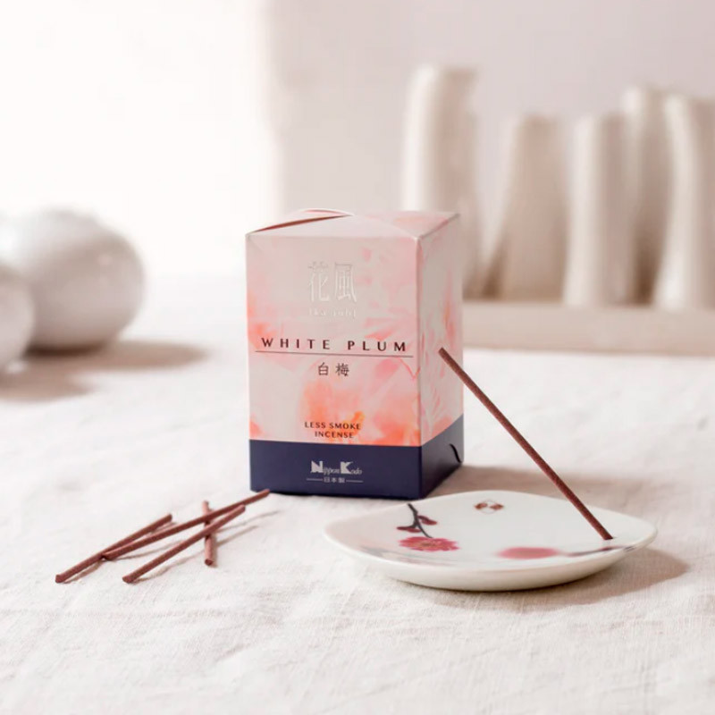 Este incienso japonés captura la fragancia pura y delicada de la flor del ciruelo blanco, símbolo en Japón de regeneración, eternidad y renacimiento. Un aroma floral blanco, suave y transparente, que evoca el despertar de la primavera tras el invierno y llena el espacio de calma y armonía.